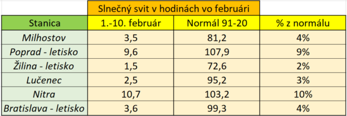 Pravdu tak majú tí, ktorí majú pocit, že je vonku akosi “temno”. Na viacerých miestach by sme zatiaľ mohli spočítať počet hodín slnečného svitu na prstoch jednej, maximálne dvoch rúk. Napr. v Žiline na letisku svietilo Slnko do 10. februára, vrátane, len necelé 2 hodiny, pričom dlhodobý februárový mesačný normál je na úrovni takmer 73 hodín (viď. obr. 1). V Bratislave na letisku dosiahol slnečný svit v rovnakom období necelé 4 hodiny, čo sú zatiaľ 4 % dlhodobého normálu rokov 1991-2020. O niečo viac Slnka zatiaľ zaznamenali niektoré časti západného Slovenska v nedeľu, 8. februára. Napr. v Nitre vtedy svietilo Slnko 7 hodín. Rovnako slnečnejšie bolo počas niektorých dní na severe krajiny. Spomenúť môžeme párhodinové zmenšenie oblačnosti v utorok, 10. februára, v oblasti Oravy alebo Zamaguria.