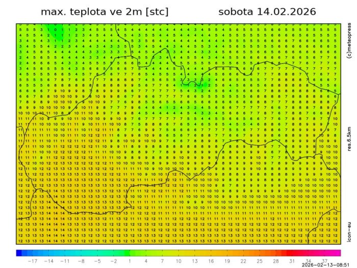 Obr. 1: Predpoveď synoptickej situácie na sobotu, 14. februára. Zdroj: ČHMÚ