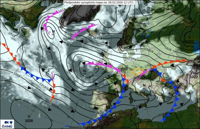 Obr. 1: Predpoveď synoptickej situácie na piatok, 6. februára. Zdroj: ČHMÚ