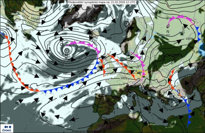 Obr. 2 Synoptická analýza na sobotu 21.2.2026, Zdroj: ČHMÚ.