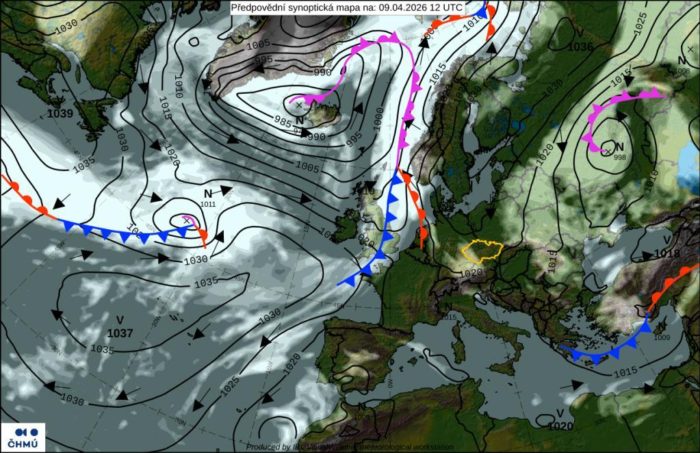 Obr. 1 Synoptická analýza na štvrtok 9.4.2024. Zdroj: ČHMÚ.