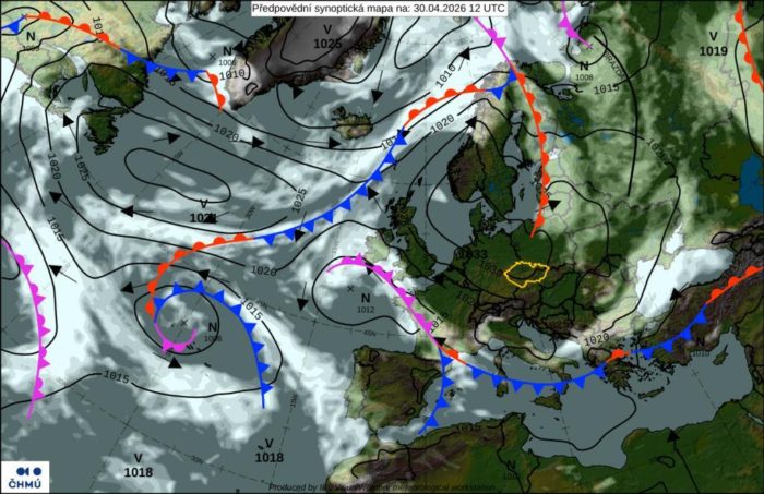 Obr. 4 Synoptická analýza na štvrtok 30.4.2026. Zdroj : ČHMÚ.