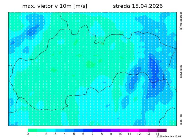 Obr. 6: Predpoveď maximálnej priemernej rýchlosti vetra podľa modelu ICON.