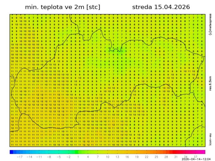 Obr. 2: Predpokladaná minimálna teplota v 2 m podľa modelu ICON.