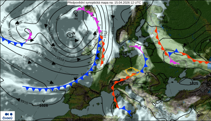 Obr. 1: Predpoveď synoptickej situácie na stredu, 15. apríla. Zdroj: ČHMÚ
