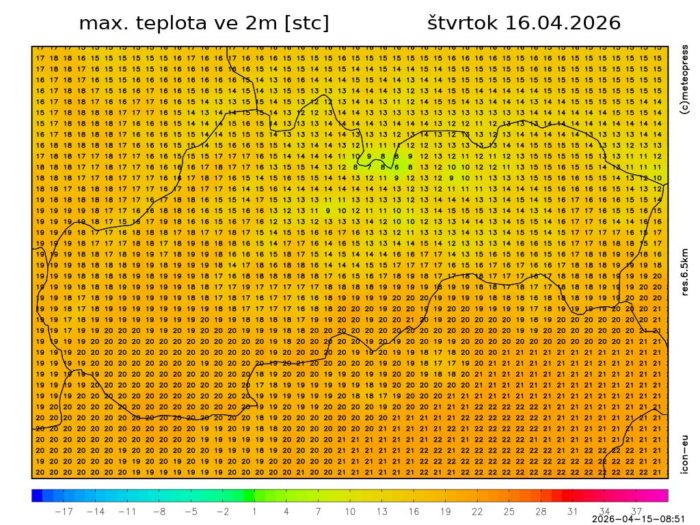 Obr. 2: Predpoveď maximálnej dennej teploty v 2 m podľa modelu ICON.