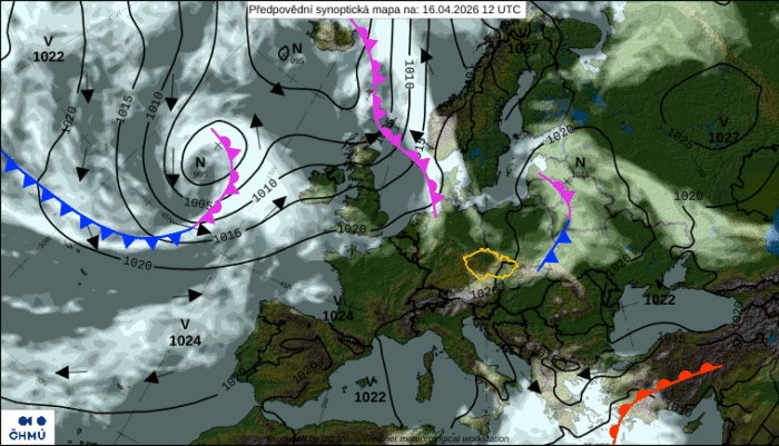 Obr. 1: Predpoveď synoptickej situácie na štvrtok, 16. apríla. Zdroj: ČHMÚ