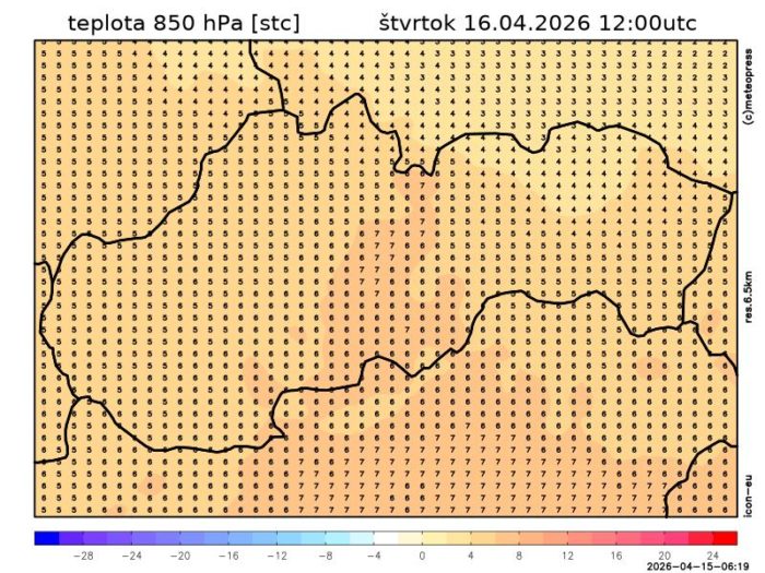 Obr. 3: Predpoveď teploty v hladine 850 hPa podľa modelu ICON.